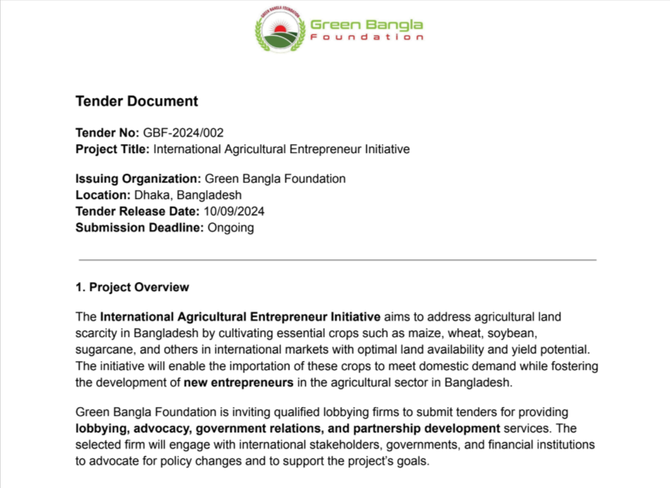 Green Bangla Foundation is seeking the services of a qualified lobbying firm to provide